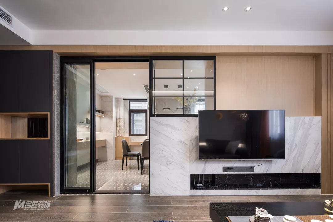 市面上电视背景墙千变万化,各有各的风韵,而在为业主设计靓家时,我们的设计师巧妙的利用半高大理石背景墙进行隔断改造,还为空间增加了收纳储存的地方,可谓兼具着美观与实用,接下来就带领大家去看看吧。